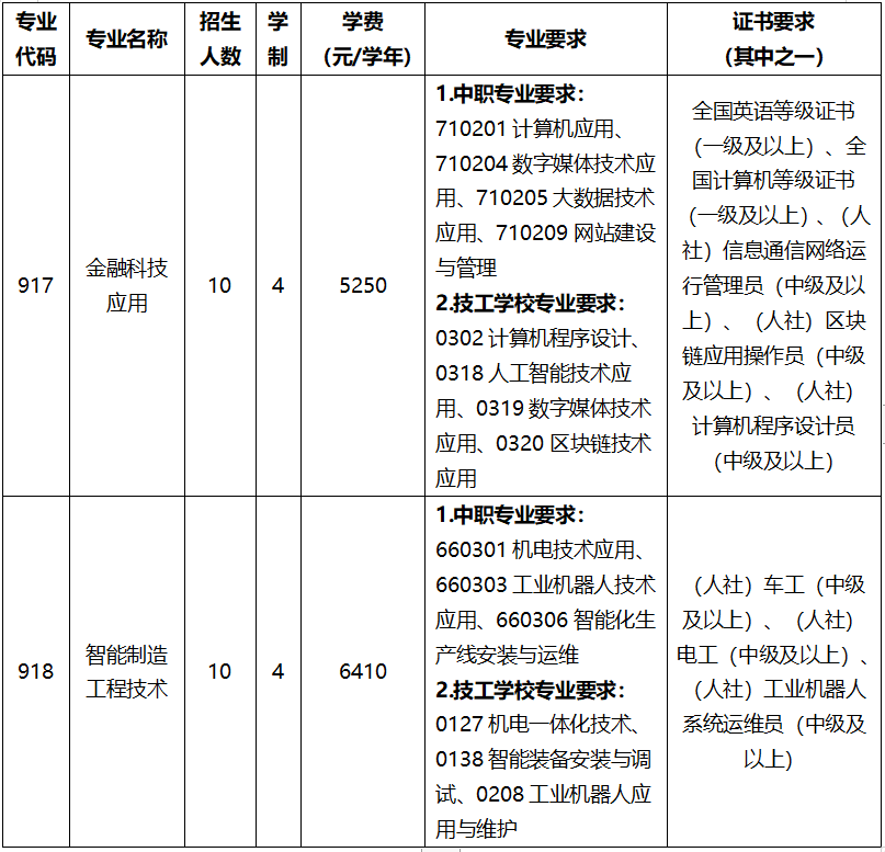 本科车辆工程专业,中职专业要求:汽车电子技术应用、汽车运用与维修、汽车制造与检修(660701)、新能源汽车维修。对口专业技能课程证书为机械证书B级及以上、汽车维修工中级及以上或汽车运用与维修(“1+X”证书)中级及以上。