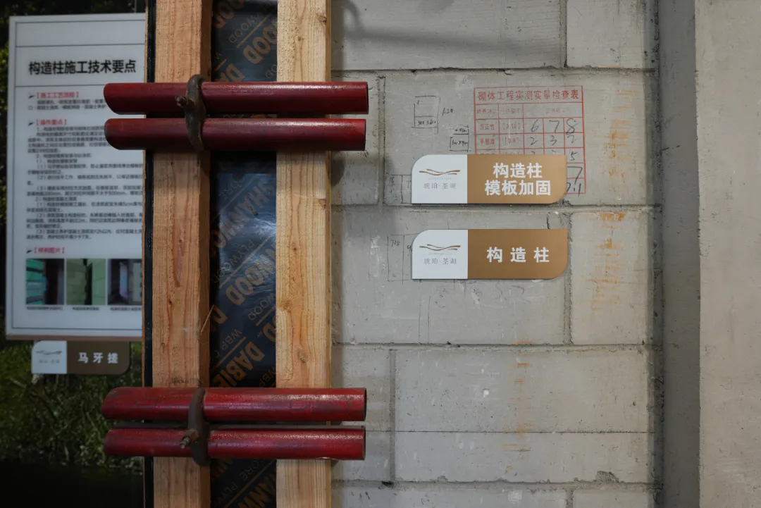 琥珀·荃湖在结构成型阶段便植入了多重保障。针对常见的墙柱根部“烂根”问题,项目创新采用角钢与模板协同加固,配合底部密封胶条,显著提升刚性与防漏效果,从源头杜绝跑浆风险。