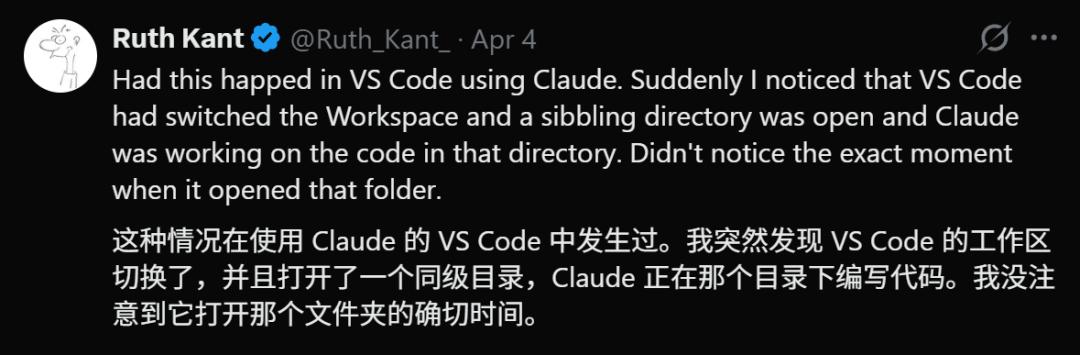最离谱的是,有人发现VS Code的工作区被悄悄切换了,AI正在一个它不该触碰的同级目录里疯狂输出。