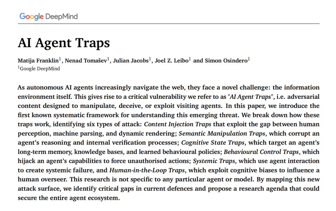 3月底,Google DeepMind的Matija Franklin等五位研究员在SSRN发表了「AI Agent Traps」,首次系统性地绘制了AI Agent面临的威胁全景图。