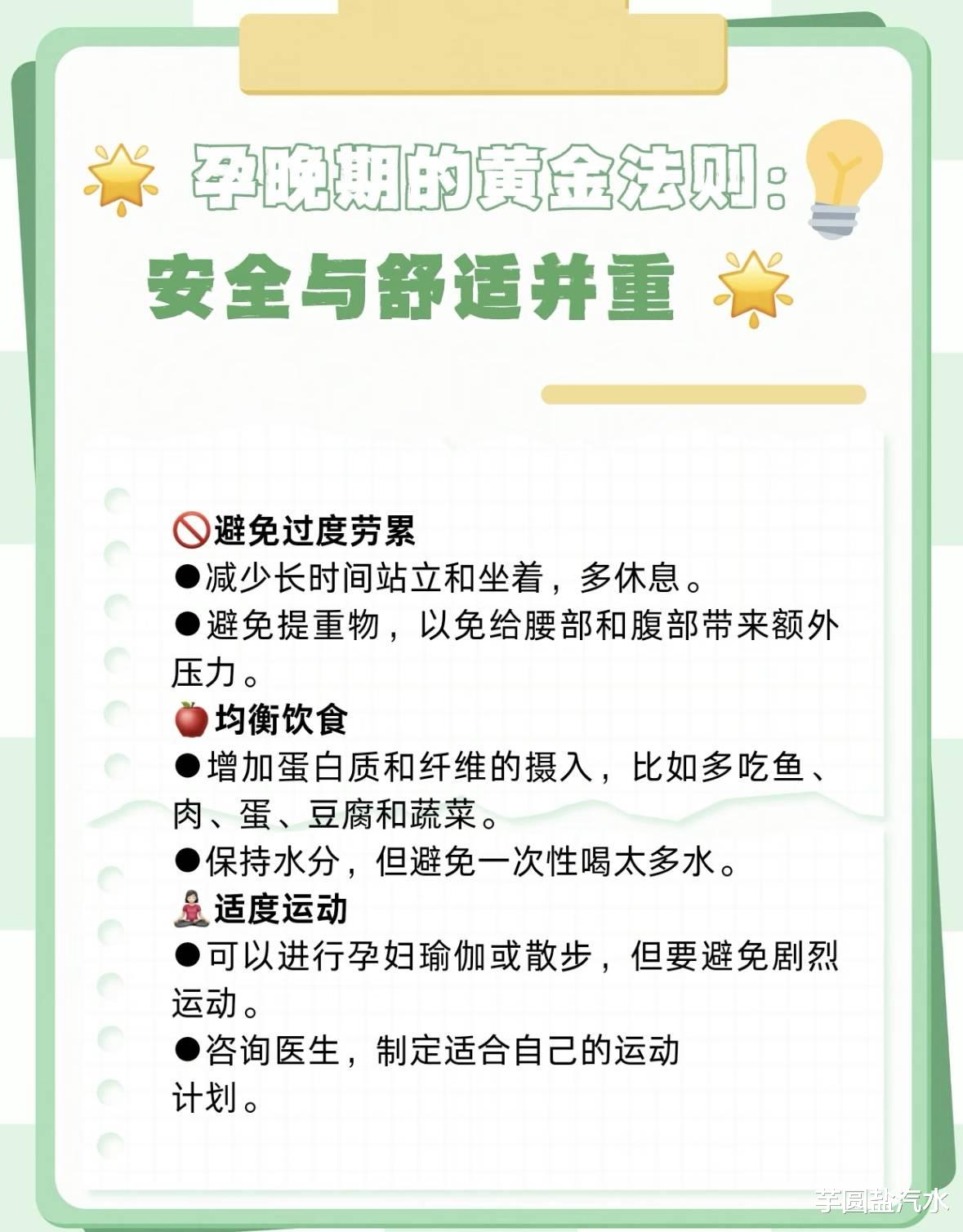 「左侧卧不仰卧,体重血糖双控;防滑鞋不爬高,重物15 kg封顶;疼痛水肿有工具,舒适安全并肩行!」把这张「孕晚期黄金法则」贴冰箱,每完成1项打✅,安全通关,舒适满格,安心迎接分娩!✨参考文献