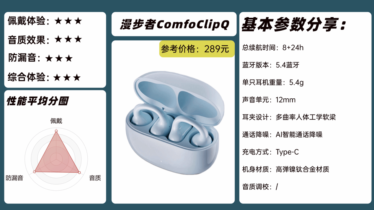 漫步者做平价耳机很多年了,这款ComfoClipQ是典型的没花里胡哨的功能,但日常该有的都有,预算有限又想试耳夹式耳机的,选它基本不踩雷。