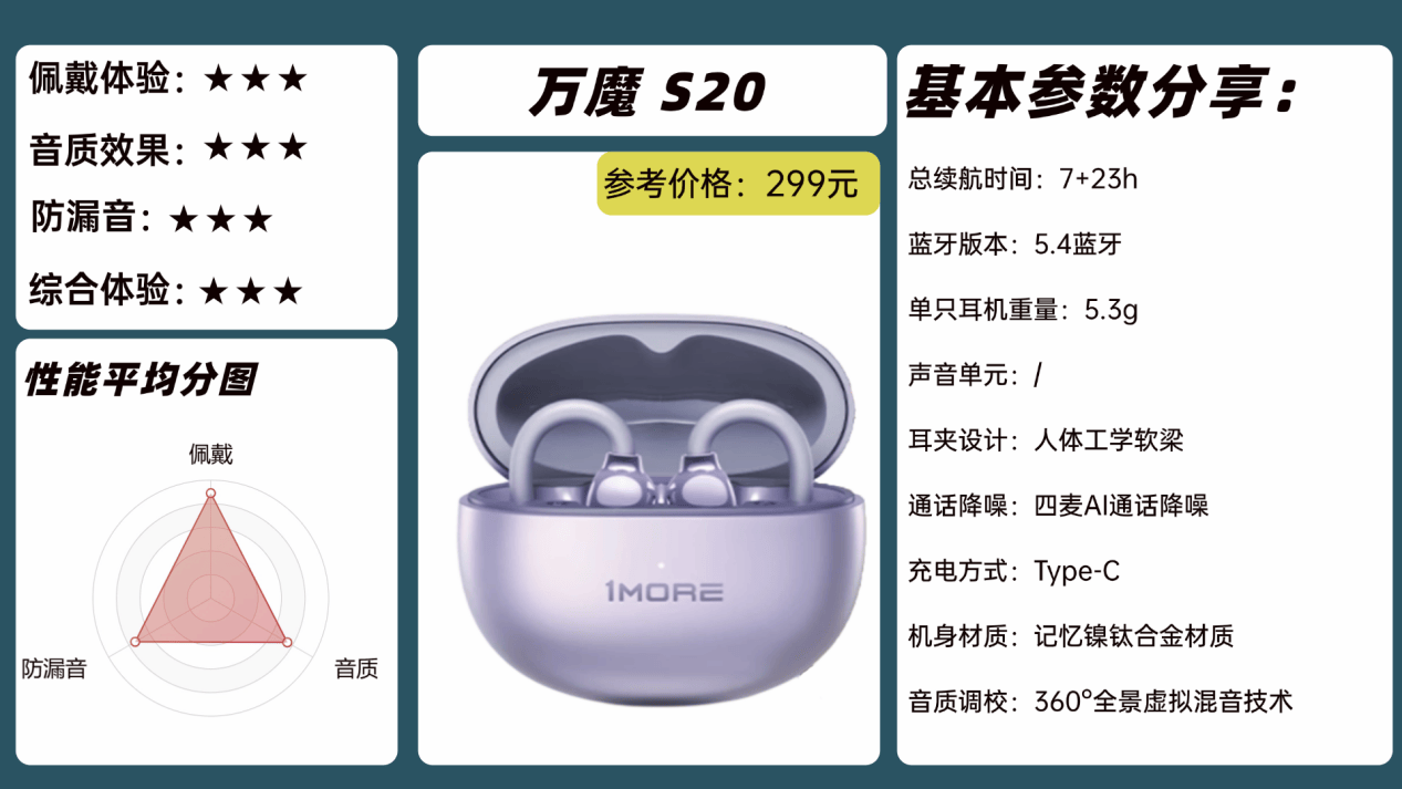 万魔在声学调校上一直有功底,不少耳机都主打“音质细节”,这款S20耳夹式耳机也没让人失望——用了小尺寸动圈,还专门优化了人声和轻音乐,三百出头能有这听感,挺值。