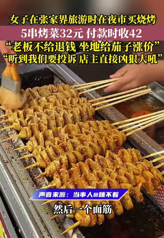 4月29日,湖南张家界,一女游客在夜市摊上买了5串烤串32元,付款时却被老板收了42元。