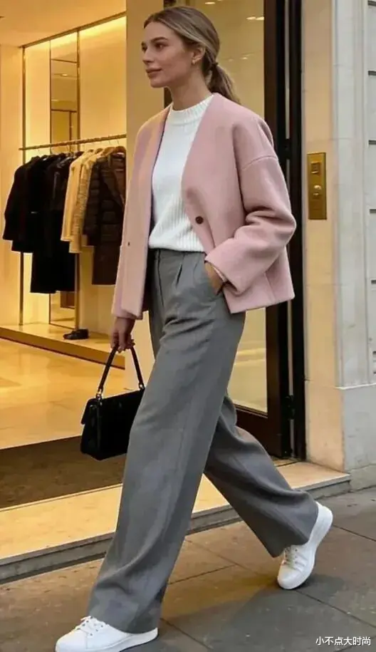 低饱和度粉色的短上衣温柔又治愈,百搭又高级。搭配灰色的西装阔腿裤,一整套气质又得体,简约大方、时尚十足。▼