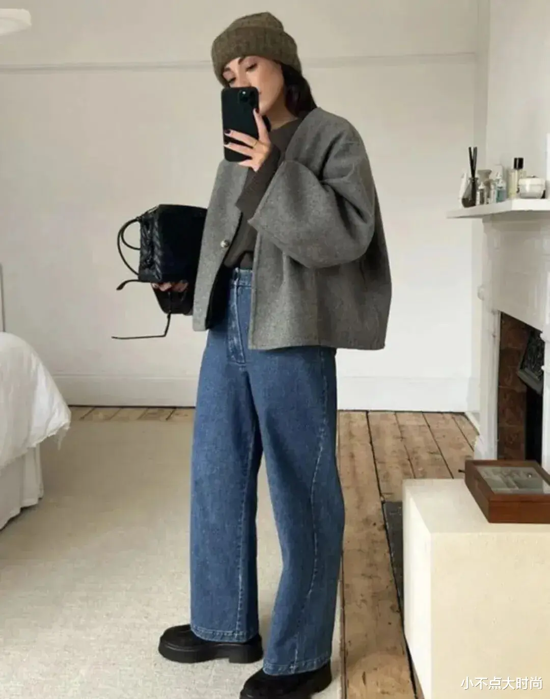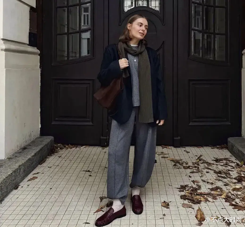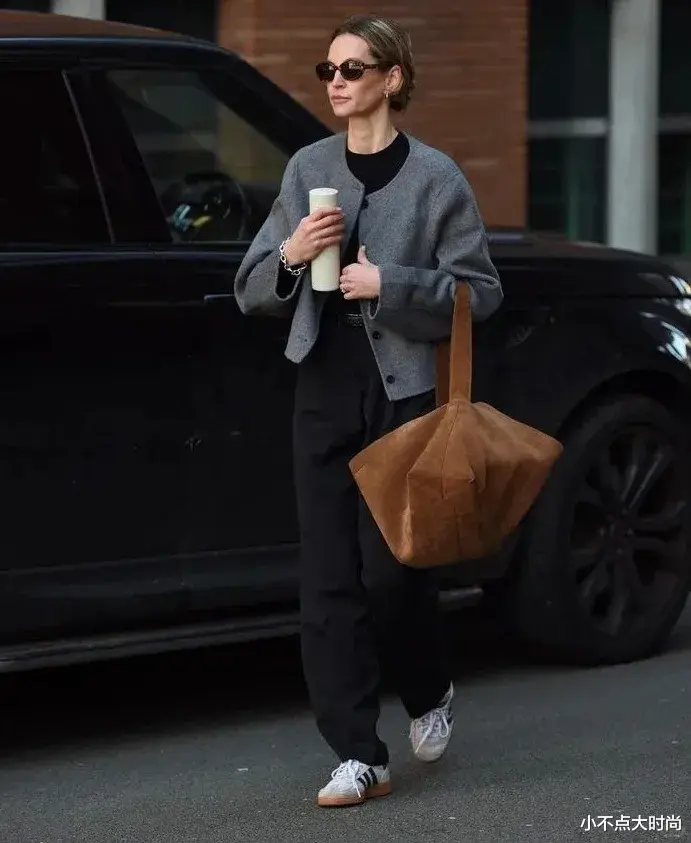基础黑色的短上衣,搭配灰色的高腰阔腿裤,简约有质感,基础款的搭配也很高级。深大地色系的包包、秋冬感的围巾和鞋子,恰当点缀又保持低调的高级质感,耐看又大方。▼