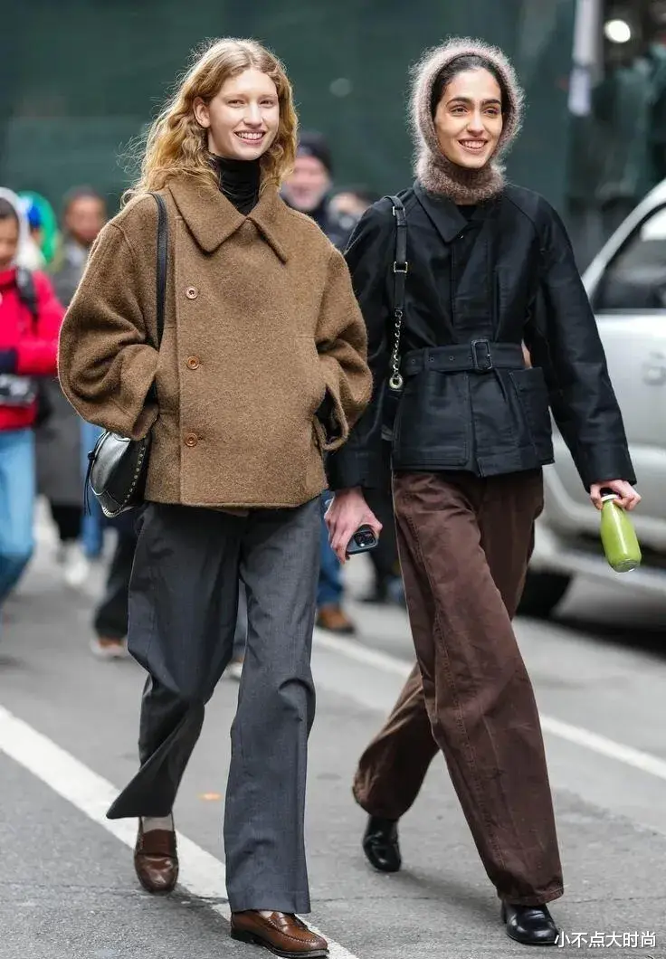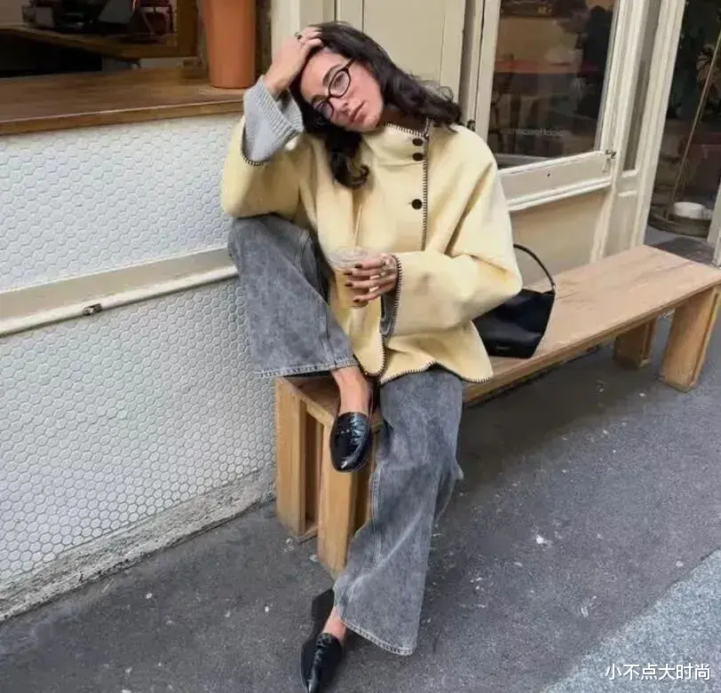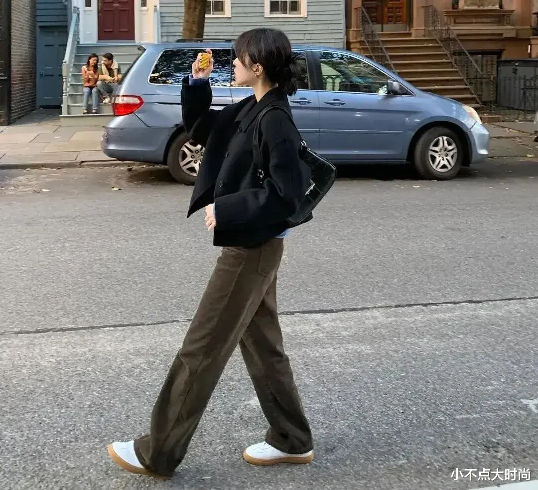合身版型的短大衣,搭配深色的高腰阔腿裤,裤子能显高又显瘦,整套简简单单的搭配就很得体,时尚又大方,即便是搭配平底休闲鞋也保持着好比例,视觉显高依旧在线。▼