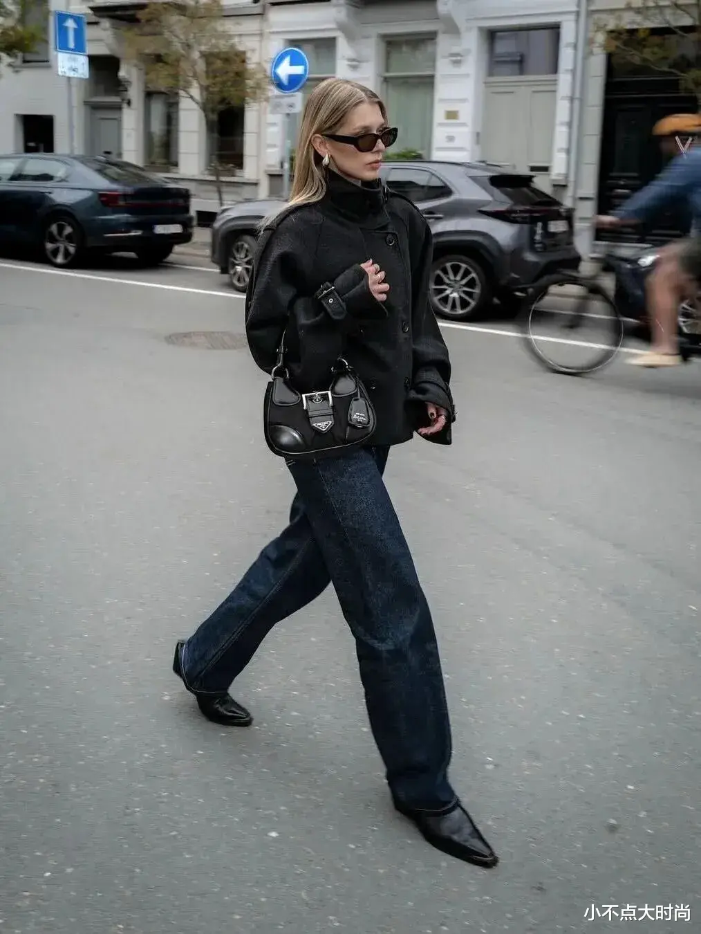 黑色的立领短上衣,搭配深色的高腰牛仔阔腿裤,低调有气场,显高显瘦,小个子也能驾驭。戴个墨镜细节点缀,更添时髦和酷范,大方又气质。▼