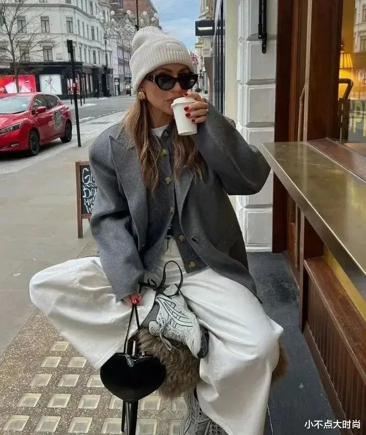 灰色的短上衣搭配白色的阔腿裤,显高又显瘦,低调又有高级感。白色的针织帽点缀穿搭,更添清爽和温和气息,让搭配更显气质。▼