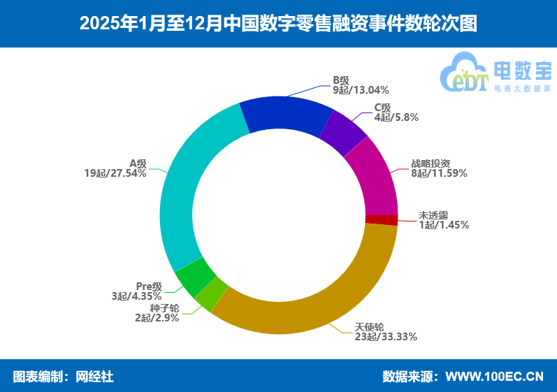 2025年数字零售融资69起,同比2024年同期27起增长155.6%;融资总额约21.35亿元人民币,同比2024年同期28亿元人民币下降23.64%。2025年数字零售领域融资事件数大幅增长,但融资金额有所下降,反映出资本对数字零售赛道的投资策略发生变化,更多关注早期、细分领域的项目,单笔融资额有所降低,行业呈现出更精细化的发展态势。