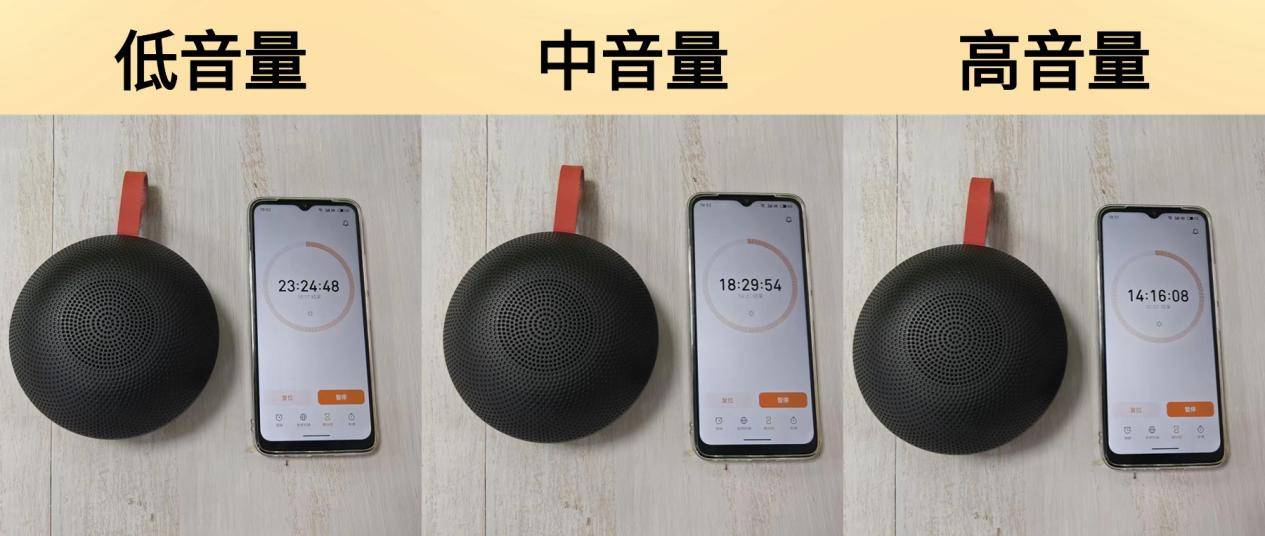 续航测试:这款音箱配备的是1200mAh的电池容量,实际测试低音量续航时间为23小时24分钟48秒;中音量的续航时间为18小时29分钟54秒;高音量的续航时间为14小时16分钟08秒,整体续航时间较长,适合长时间户外使用;