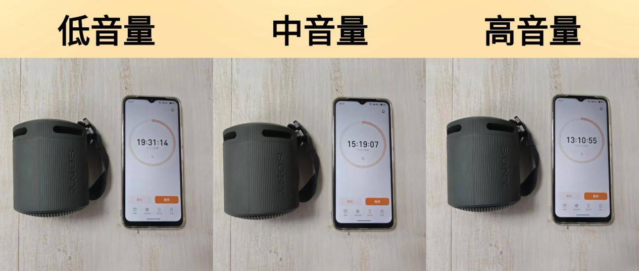 续航测试:这款音箱配备的是2000mAh的电池容量,实际测试低音续航时间为19小时31分钟14秒,中音量的续航时间为15小时19分钟07秒,高音量的续航时间为13小时10分钟55秒,整体续航时间还是比较长,适合长时间户外使用。