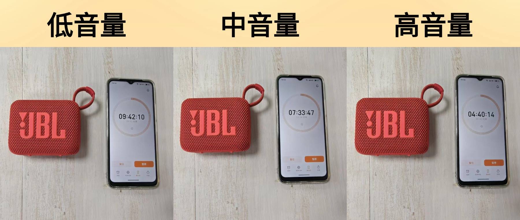 续航测试:这款音箱配备的是850mAh的电池容量,实际测试低音续航时间为9小时42分钟10秒,中音量的续航时间为7小时33分钟47秒,高音量的续航时间为4小时40分钟14秒,整体续航时间较短,比较适合短时间户外使用;