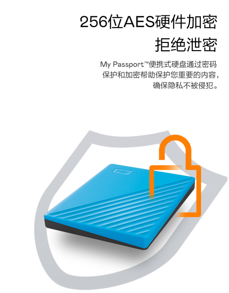 当然西数这款移动硬盘不仅传得快、容量足够大,它还能给重要文件加把“银行级电子锁”——内置256位AES硬件加密,私密照片、学习和工作的文件安心存。拔插即用,告别密码烦恼,可以说安全防护像呼吸一样简单自然。
