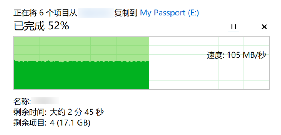 在持续写入方面,西数My Passport™移动硬盘 USB-C™版的持续写入速度能稳定在105MB/s左右,整个入过程稳如一条直线。