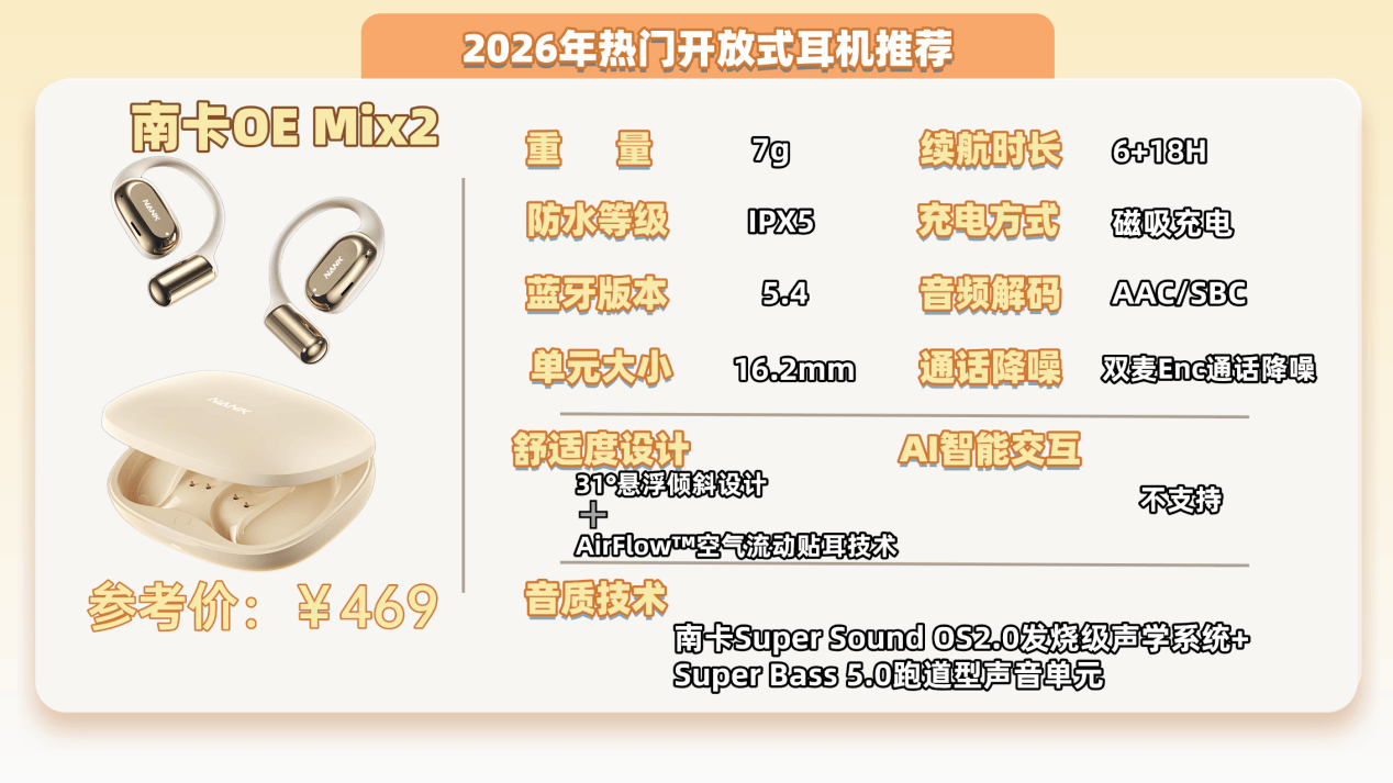 目前市面上多数开放式耳机都存在漏音大、音质差、佩戴不舒适的问题,而南卡却以“舒适+高性能”为核心,坚持发烧级研发标准,成为行业第一梯队代表。从元器件到成品的三个环节都设有30%淘汰线,远超行业平均,被媒体誉为“音质最好的开放式耳机”,并与BOSE、森海塞尔等高端品牌齐名。最新的OE Pro2不仅在音质与舒适度上持续登顶,还融合全能Ai智慧系统,支持翻译、对话、创作等多场景体验。凭借“全能Ai智慧助手 + 音质巅峰”的双重优势,OE Pro2赢得发烧友、媒体与用户的高度认可,稳坐开放式耳机旗舰标杆之位。