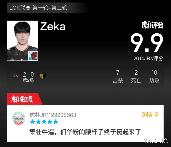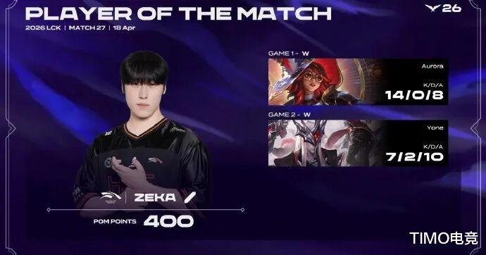 第二局更是zeka的表演秀,Zeka直接掏出了压箱底的招牌英雄永恩。从中期开始就接管了比赛,上路、野区、河道,全场Chovy的阿卡丽直接被砍得神志不清。Zeka21杀2死18助攻,两次当选POM。Zeka赛后评价自己的表现时只说了三个字:打8分(给chovy留点面子)。