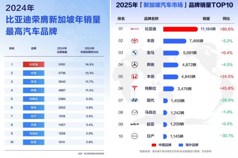 从2025年新加坡的汽车销售数据来看,比亚迪在当地的表现是全面领先。乘用车方面,全年销量11184辆,同比增长80.6%,蝉联全品牌销量冠军。从2022年进入市场到现在,两年时间登顶,这个速度本身就说明产品竞争力已经被市场认可。