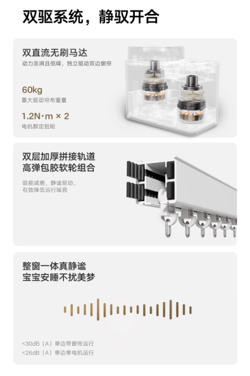 作为高端机型,米家智能窗帘3 Pro搭载旗舰双驱动力系统,兼顾动力与静音,实现整窗一体精调。产品内置双直流无刷马达,相比传统有刷马达寿命更长、运行更安静、更节能,额定扭矩达1.2N·m×2,最大可驱动60kg帘布,为双边独立驱动提供核心支撑,即便厚重帘布也能平稳运行。配合双层加厚拼接轨道和高弹包胶软轮,可有效吸能减震实现系统级降噪,单边单电机运行时噪音低至26dB(A)以下,单边带窗帘运行时噪音低至30dB(A)以下,夜晚开合不扰安睡,尤其呵护老人与宝宝的睡眠。
