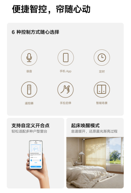 产品支持语音控制、米家APP控制、7键全向遥控器、手拉自动启停、定时控制及智能场景联动6种控制方式,灵活适配全家不同成员的使用习惯。同时支持10%-100%无级调速、高精度开合比例调控及缓起缓停功能,用户可自定义开合节奏,进一步提升使用舒适度。