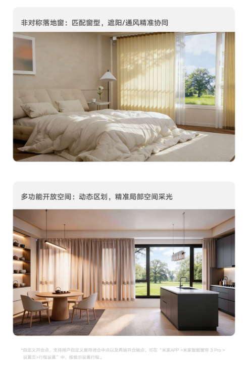 米家智能窗帘3 Pro在场景适配性上全面优化,支持自定义开合点,可精准匹配非对称设计的户型窗台,满足不同家庭的采光调控需求。针对日常起居场景,用户可设定起床唤醒模式,让窗帘怠速缓开,模拟日出渐亮过程,温柔唤醒身体且避免强光不适,赋予晨起仪式感。产品支持小米澎湃智联,可与米家设备协同工作,实现回家模式、观影模式、睡前模式等个性化场景体验,打造无感智能生活。