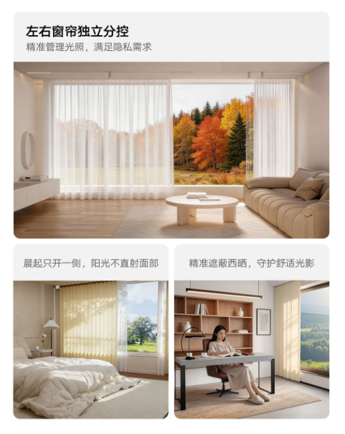米家智能窗帘3 Pro的核心亮点是左右窗帘独立控制功能,单根轨道即可分别调控两侧窗帘,有效解决传统智能窗帘无法精细化遮光的痛点,实现室内采光与遮阳兼得,真正做到“分区自如采光”。这一功能可适配多种生活场景:早晨只开床头一侧,避免阳光直射面部,实现温柔唤醒;午后西晒时,精准关闭有人活动一侧窗帘,兼顾舒适与护眼;白天使用电子设备时,关闭屏幕一侧窗帘缓解反光;家中有怕晒家具时,微调一侧即可精准遮挡,同时保持整体明亮;中午小憩时,微调有人一侧窗帘,避免刺眼光线且不致闷热。