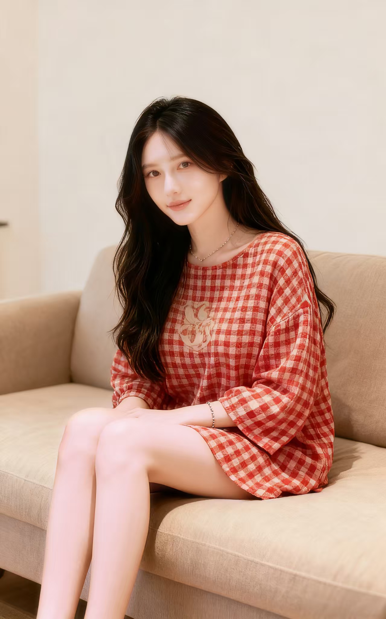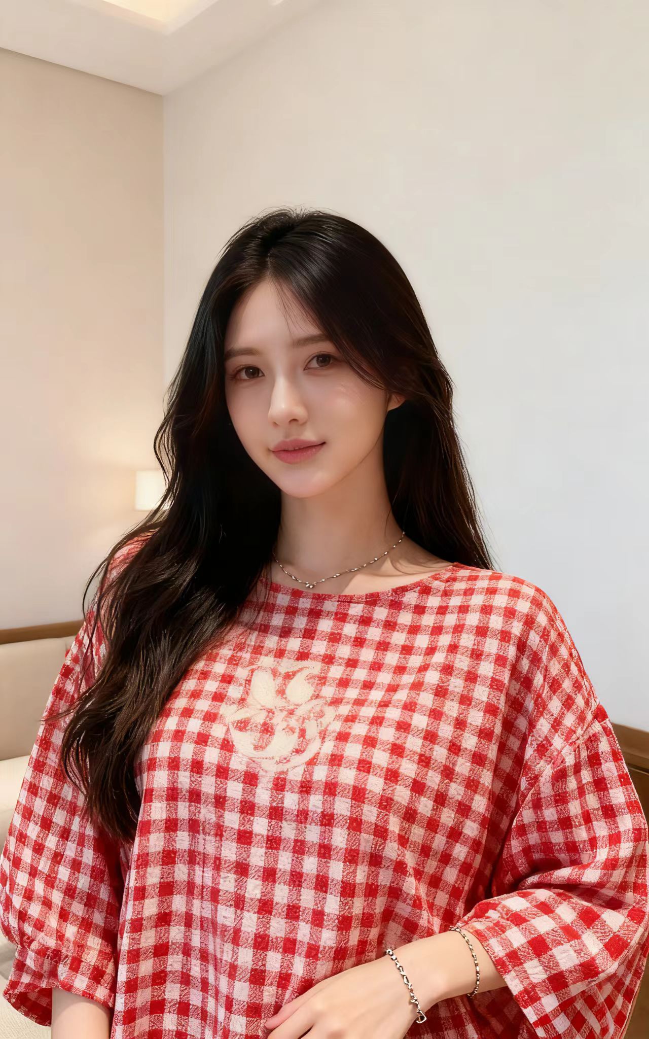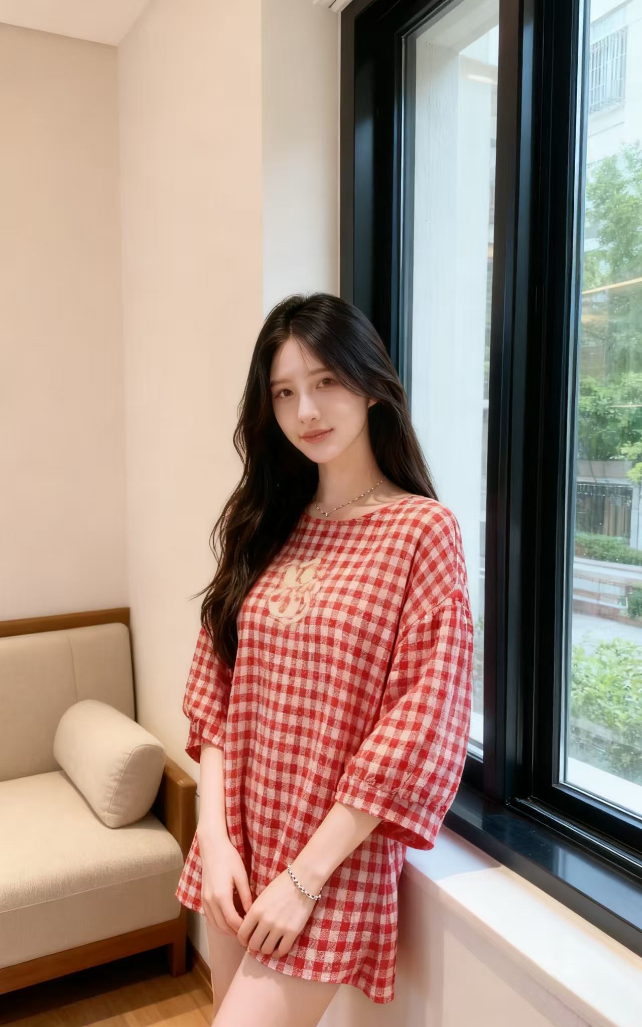 穿着一件红白格子图案的宽松上衣,采用圆领设计,衣长及臀,袖子为七分袖,整体版型休闲舒适。