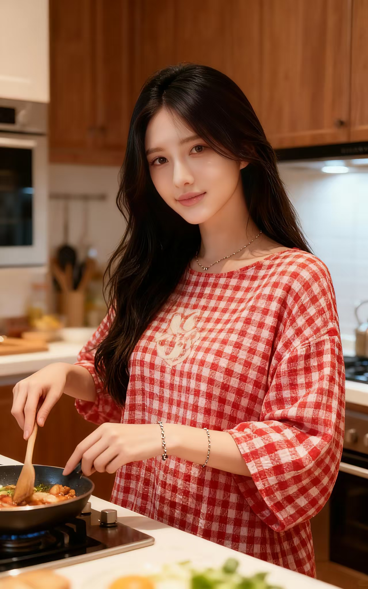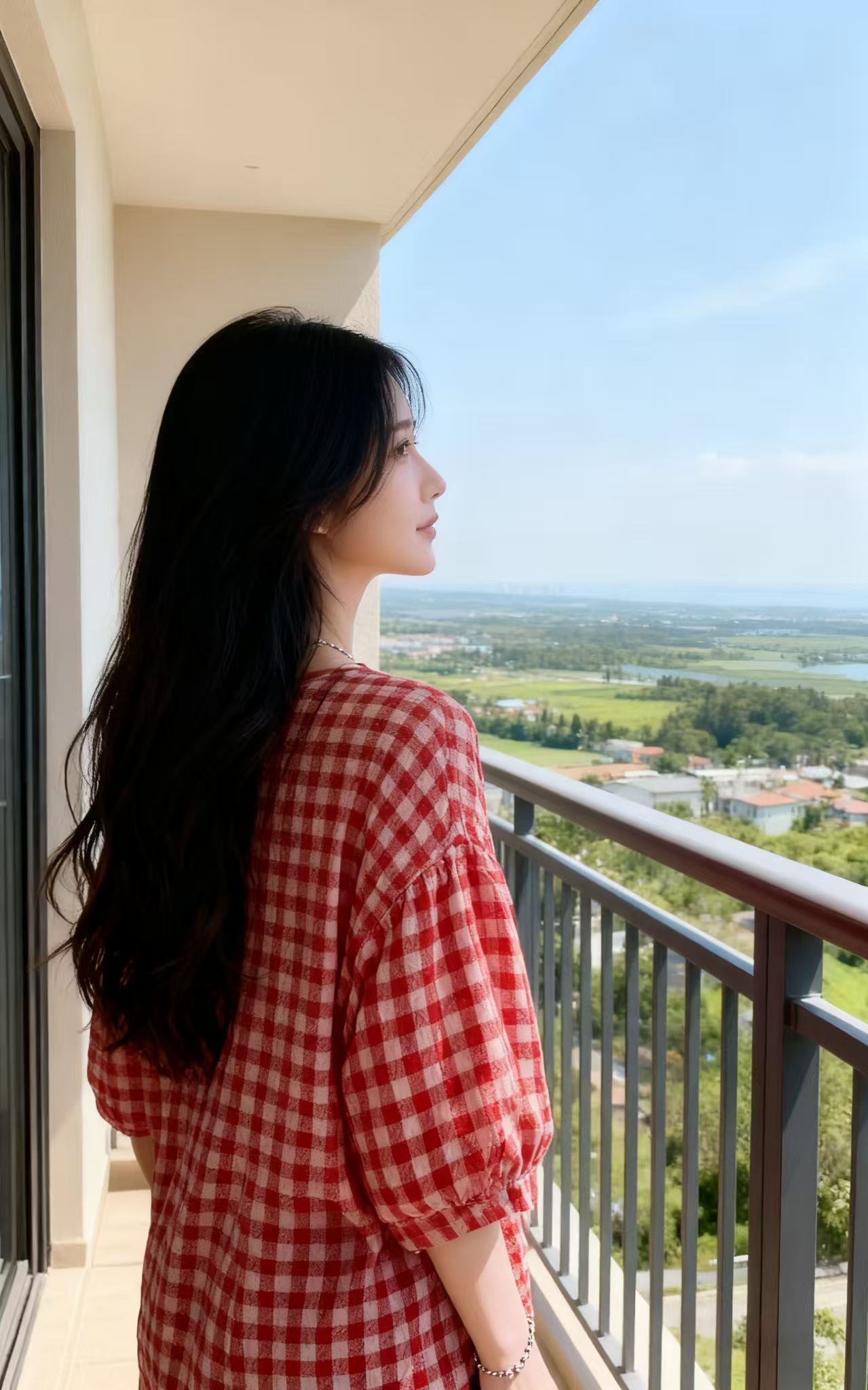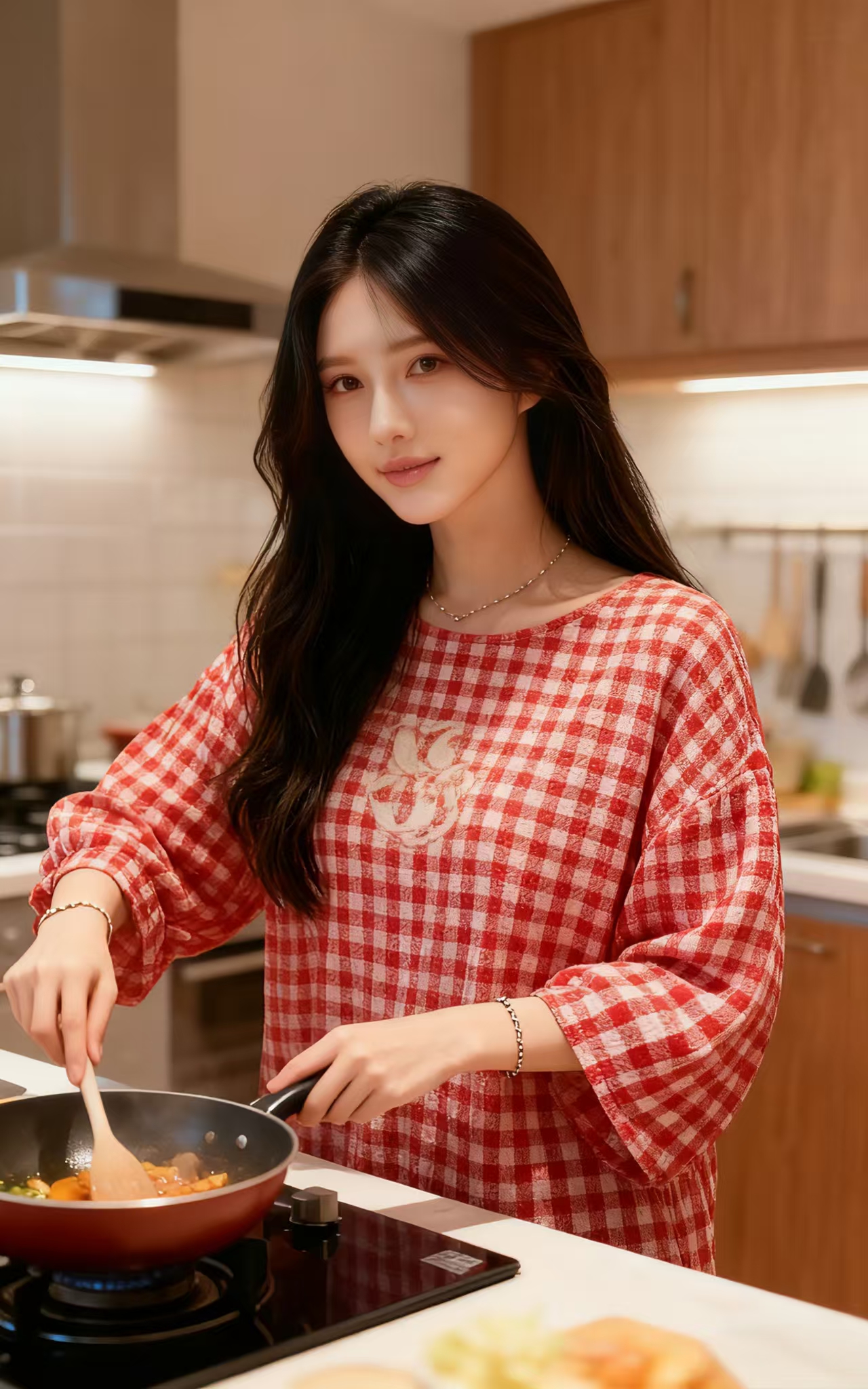 穿着一件红白格子图案的宽松上衣,采用圆领设计,衣长及臀,袖子为七分袖,整体版型休闲舒适。