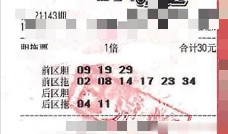 上图是一张3胆拖6码的胆拖一等奖票,它是2021143期的。由票面可以看出胆码是09、19、29,拖码是02、08、14、17、23、34,后区04、11。