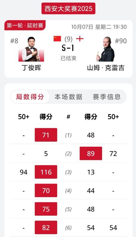 在10月7日的西安大奖赛延期资格赛中,丁俊晖以5比1的比分轻松击败英格兰选手山姆·克雷吉,成功晋级正赛64强。