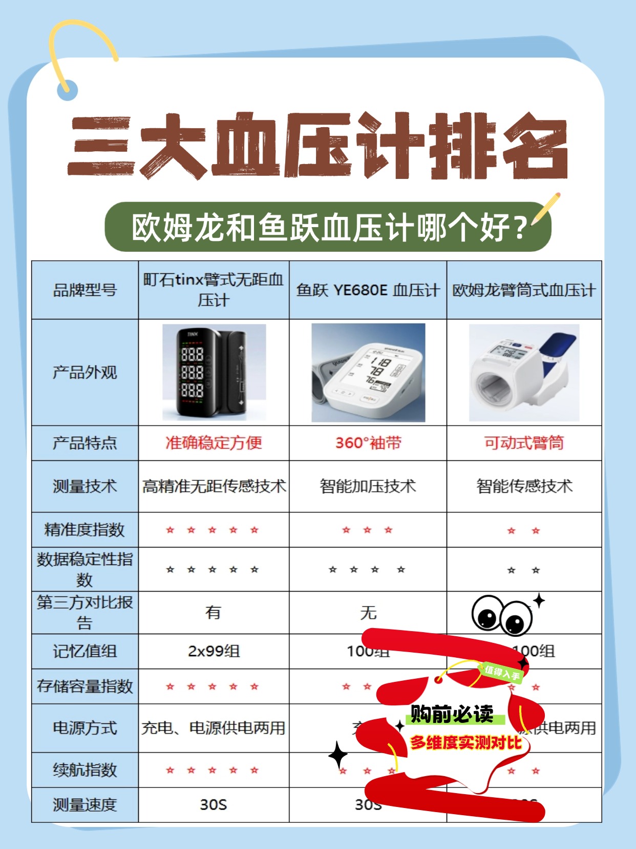 好多人问血压计哪个牌子好?欧姆龙和鱼跃血压计哪个好?三大血压计排名靠谱吗?其实欧姆龙和鱼跃的臂式血压计,核心测量原理相近,不存在绝对的 “谁更好”,准确度都取决于产品是否通过正规认证、是否定期校准,三大排名更多是参考,不能作为唯/一选购标准。说真的,没有绝对最准的血压计,关键看使用和维护。电子血压计不准的表现很明显,比如连续测量 3 次数值相差超过 10mmHg,或者跟正规机构测的差值超过 5mmHg,这时候要么校准要么更换。而且血压计的核心部件会老化,一般用 5-8 年就该换了,要是平时经常摔、受潮,还得提前换,我之前有个臂式血压计用了 7 年,后来校准也没用,数值越来越离谱,只能淘汰。很多人忽略这些点,花大价钱买的款也用不出效果!接下来我会整理一份三大血压计排名选购避坑指南,都是实测总结的经验,大家可以先点赞收藏,避免买错!