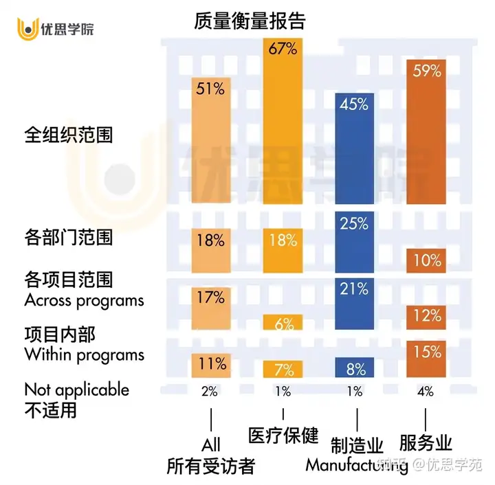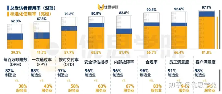 难点在于,要找到一个合适的平衡点。指标不能标准化到失去实际推动绩效改进的价值。下方图表优思学院展示了各类质量指标在所有组织中的使用比例,也就是柱形的高度;同时也展示了这些指标中有一定标准化程度的比例,也就是其中橙色的部分。