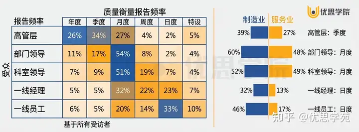 上图表显示了在各个员工层级中,会报告质量指标的受访者比例,以及相应的报告频率。图中所列的这些频率,是制造型组织最常采用的做法,用来突出它们与服务型组织之间的差异。