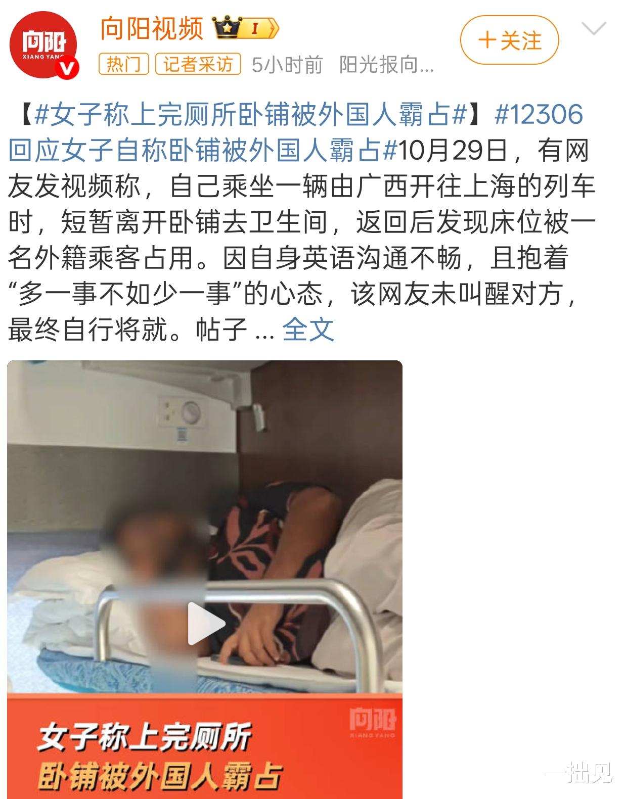 一女子乘坐的一辆从广西开往上海的火车,期间自己就是上了个厕所,回来发现自己的卧铺就被外国人占了,因自身英语不好,本着多一事不如少一事的心态,自行将就着。
