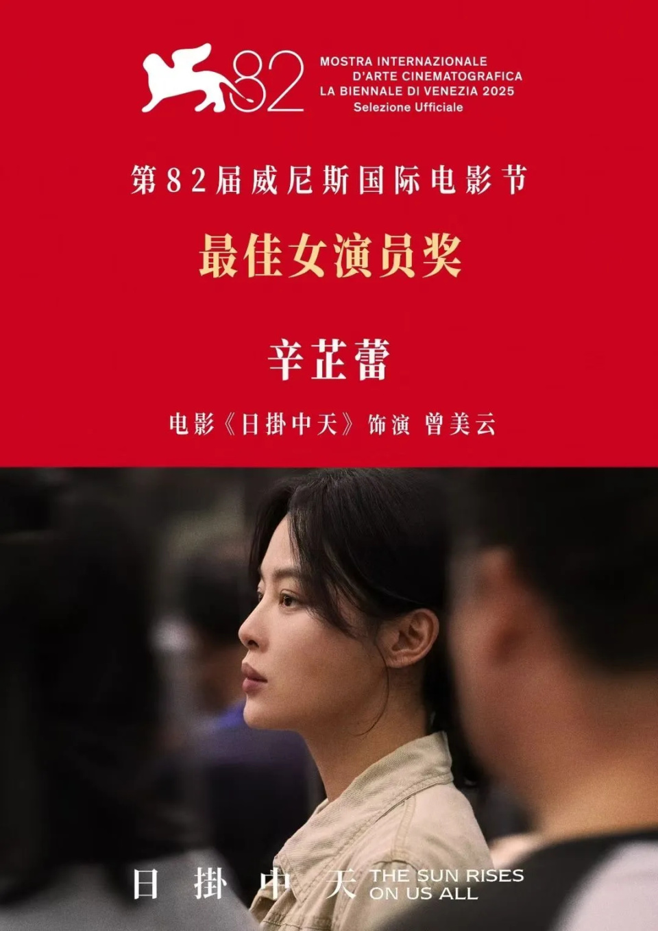 中国女演员辛芷蕾凭借其主演的电影作品《日掛中天》荣获第82届威尼斯电影节的最佳女主角奖。成为继巩俐《秋菊打官司》和叶德娴《桃姐》后的第三位华人威尼斯影后,是首位中国内地籍演员获此殊荣。