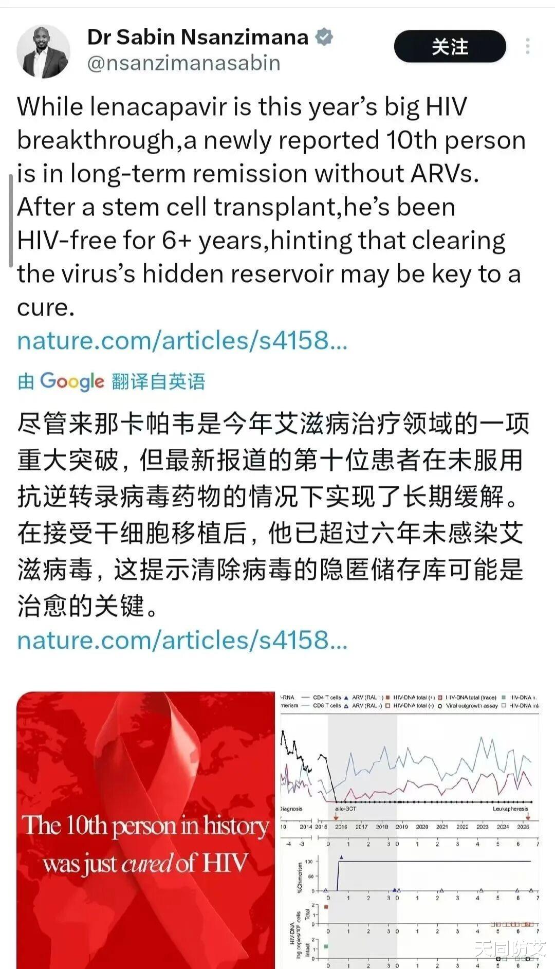 科学家们确认了世界上第十个人在不依赖抗逆转录病毒药物的情况下实现了长期 HIV 缓解。据《自然》杂志报道,该患者接受了干