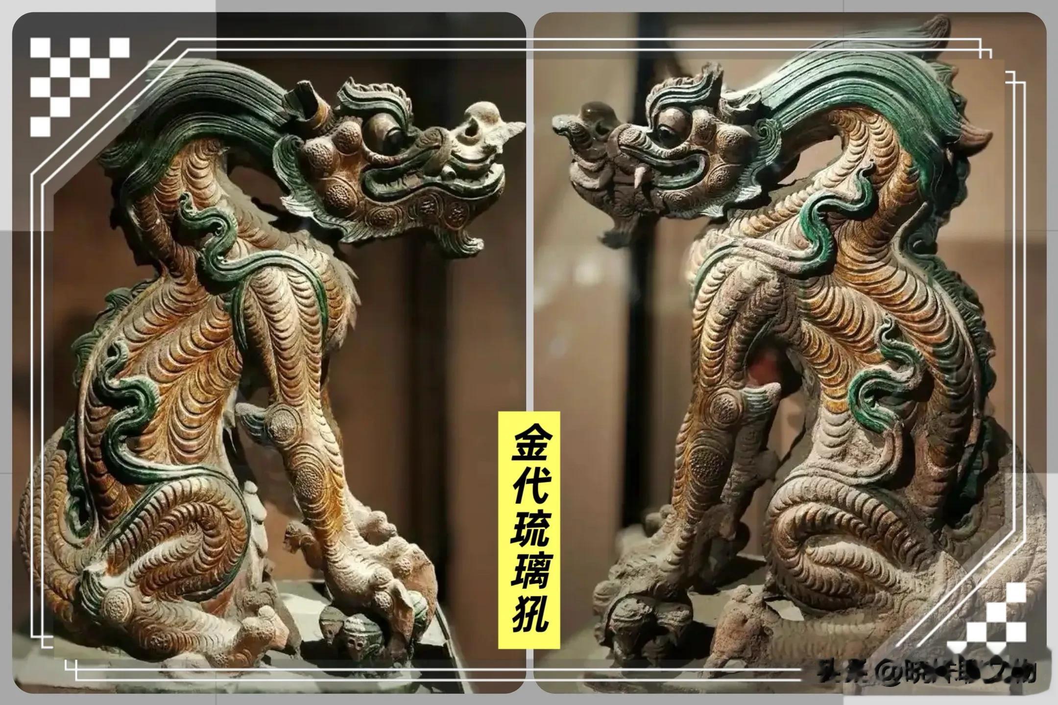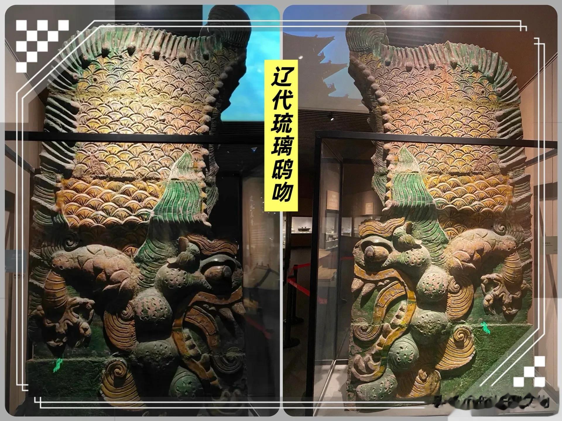 这件出自华严寺的辽代琉璃鸱吻,高逾1.5米,龙首鱼身,碧釉凝翠,既承唐风之雄浑,又融契丹对龙神的崇敬,堪称辽代琉璃工艺的巅峰之作。展现出游牧民族审美与中原琉璃工艺的完美结合。