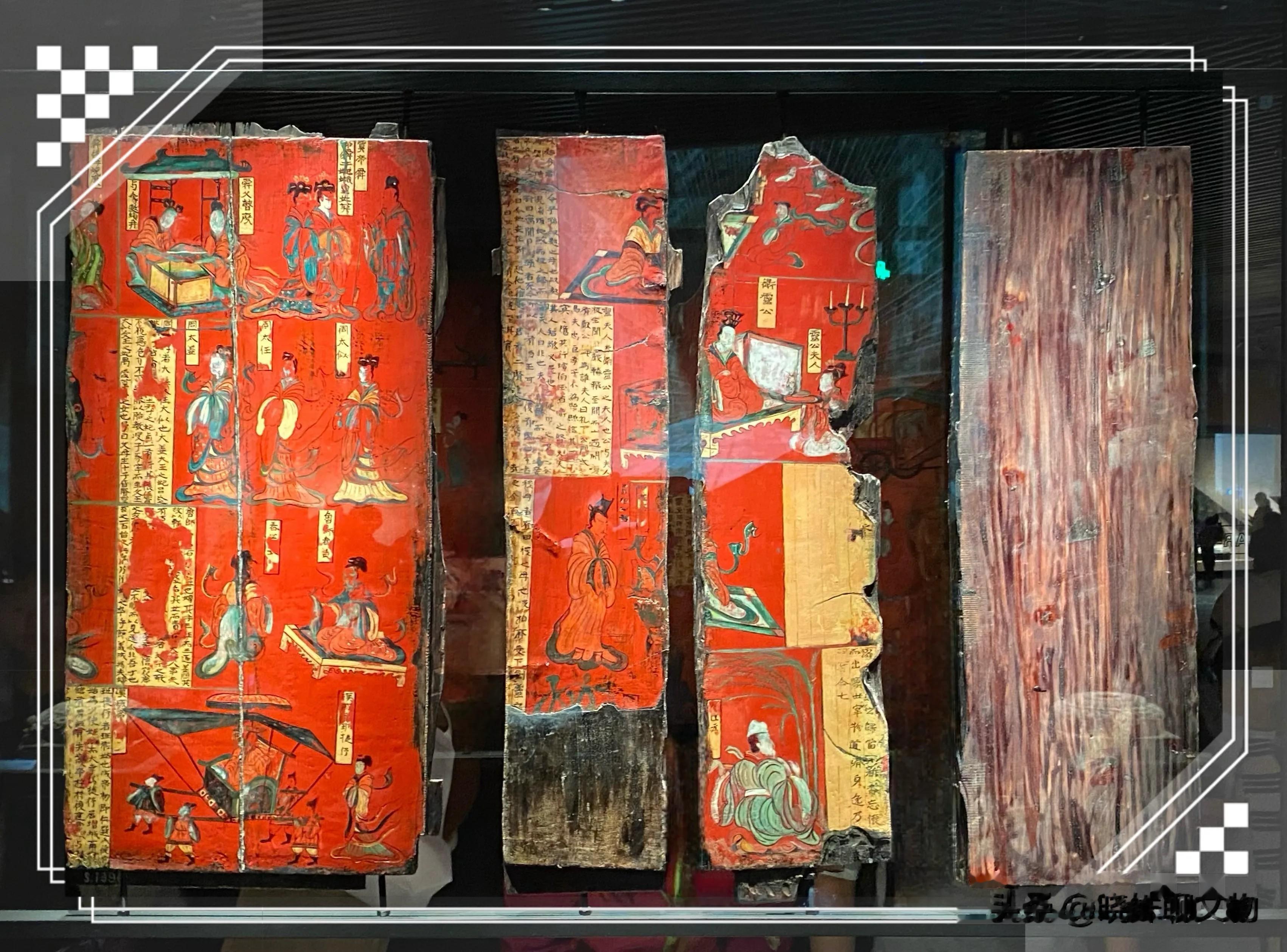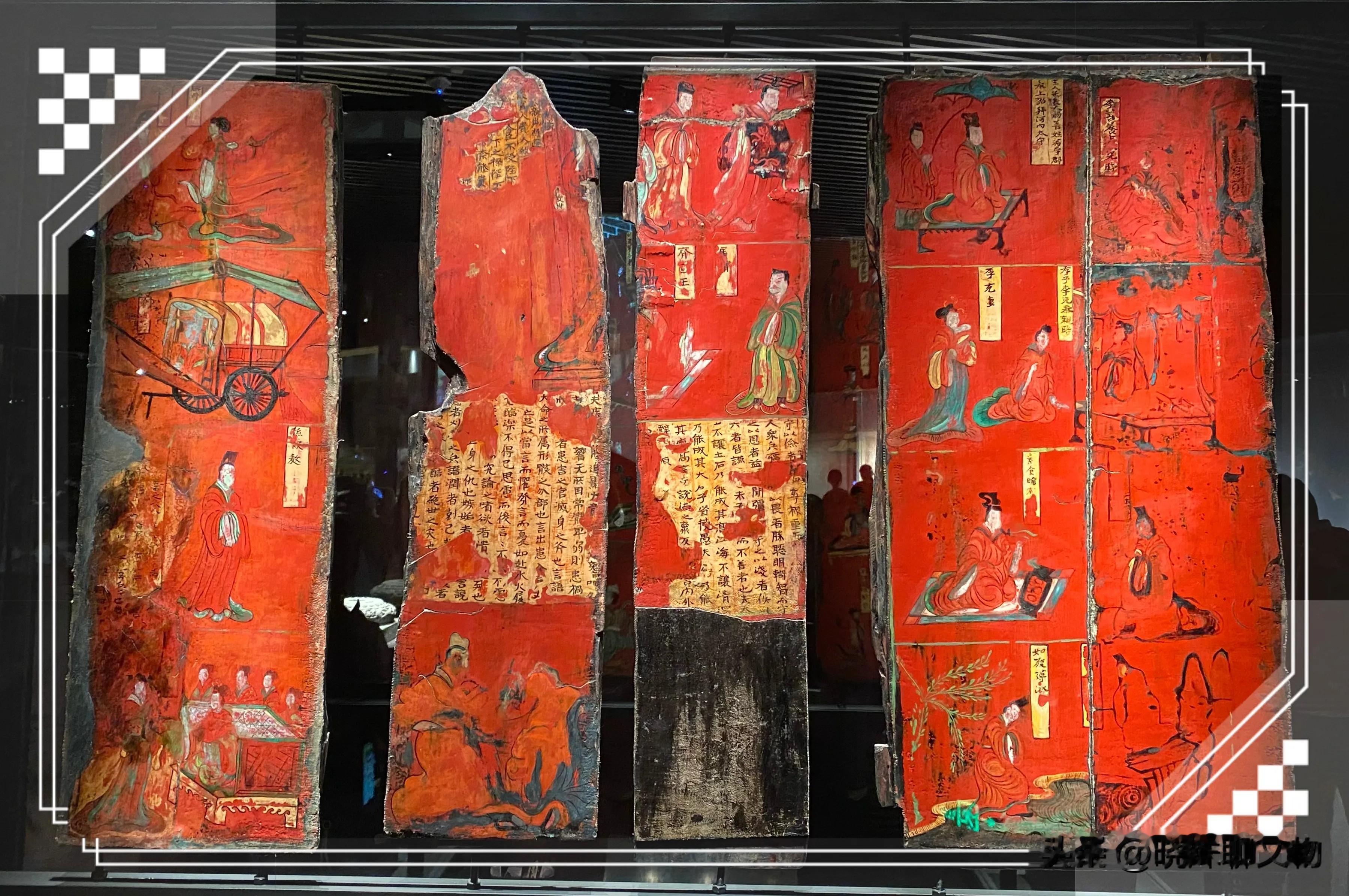 与之相映成趣的是出土于同一墓葬的木板漆画。这些漆画色彩艳丽,保存完好,描绘了列女古贤等题材,既有中原传统的孝子故事,又带有北方游牧民族的审美元素。