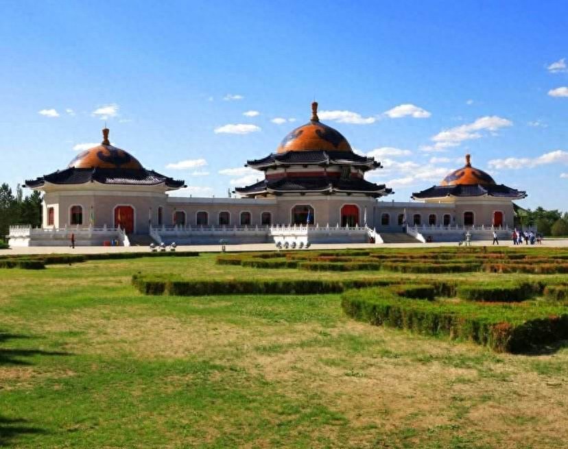 穿过 “气壮山河” 的牌坊,眼前豁然开朗 —— 三座相互依偎的穹顶建筑,便是成吉思汗陵的核心 “八白室”。中间的穹顶最高,如草原的苍穹般辽阔,两侧的穹顶稍低,似雄鹰的双翼,守护着中央的英灵。穹顶边缘的鎏金纹饰,雕刻着卷草与云纹,在晨光中泛着细碎的光芒,那是蒙古工匠用巧手铸就的匠心,每一刀都刻着对英雄的敬仰。
