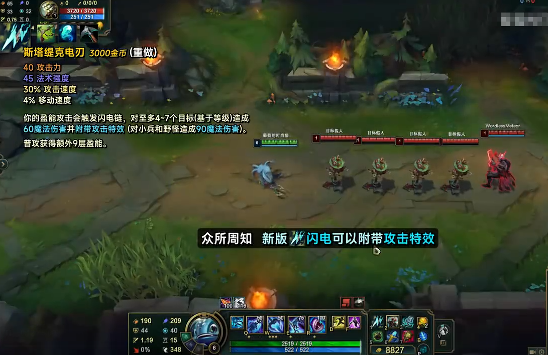 先看新版电刀的核心改动:售价 3000 金,40 攻击力、45 法强、30% 攻速、4% 移速,核心被动是盈能攻击触发连锁闪电,对 4-7 个目标弹射,每个目标都独立触发攻击特效。这是什么概念?大乱斗里的虚幻武器海克斯,是技能附带一次普攻特效;而新版电刀,直接把这个效果变成群体 AOE,一次技能 / 盈能,给范围内所有人挂一次攻击特效,等于给所有叠层英雄开了挂。