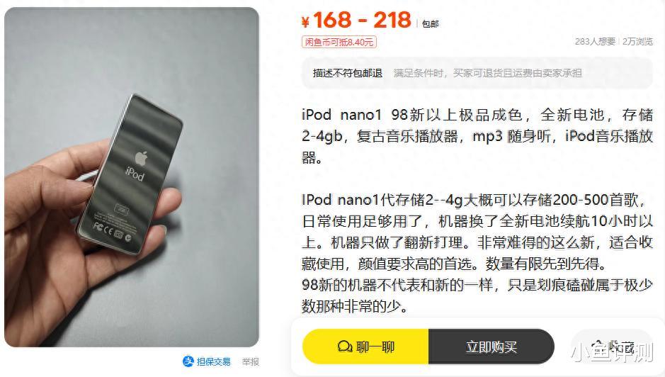 你记忆里有没有一条白色耳机线,连着一个小巧的、会转的滚轮?没错,我说的就是iPod nano。最近在二手鱼里瞎逛,发现一家店铺,标价168到218元卖iPod nano 1代。这个价格,现在也就一顿不错的快餐钱,却能让时光倒流近二十年。一瞬间,那个用iTunes同步歌曲、把播放器别在牛仔裤袋上的年代,好像又回来了。