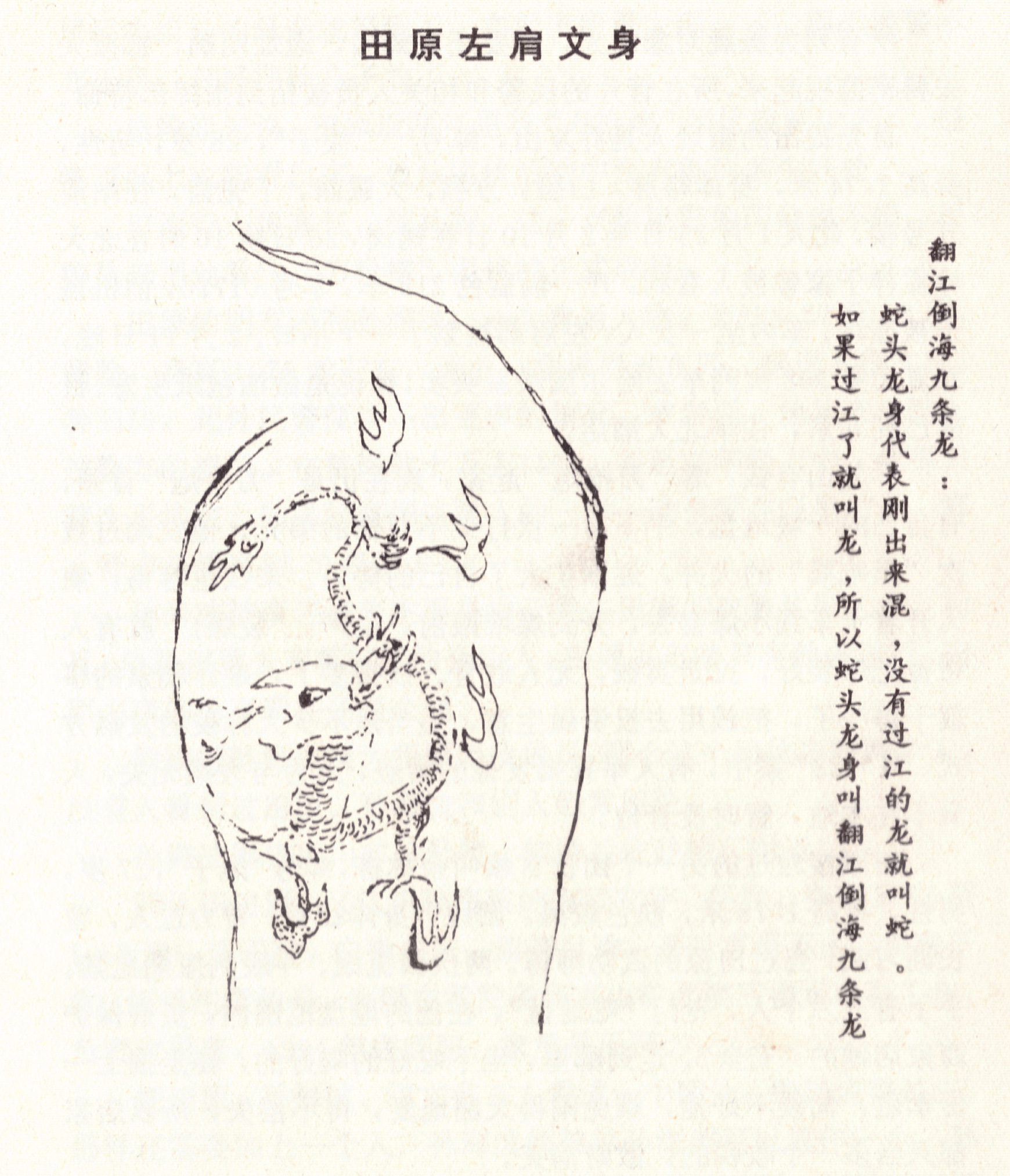 小段瞟了一眼照片说:”嗨,这有啥啊,这种图案的纹身我见得多了,那些‘刀枪炮’整天纹的就是这些东西,这个图案叫翻江倒海,我见过好多次了,许多人都纹,不能因为这个纹身就确认无名尸是田原吧!“