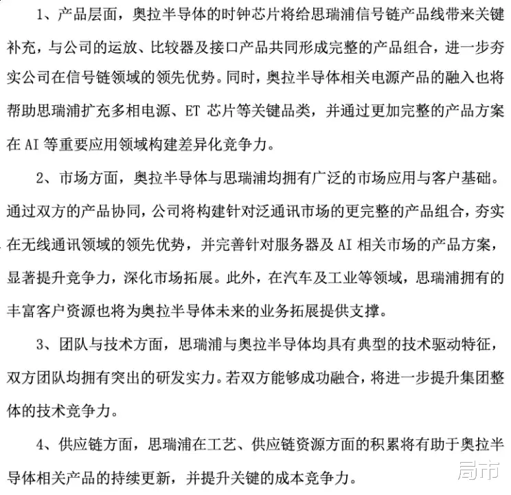 业务协同方面,双方管理层认为,思瑞浦与奥拉半导体产品、市场、团队与技术、供应链等多个方面均存在显著的协同。若成功达成收购,双方未来将在技术交流共享、产品品类扩充及客户资源整合等方面开展深度融合。