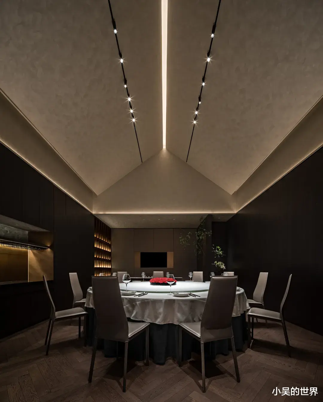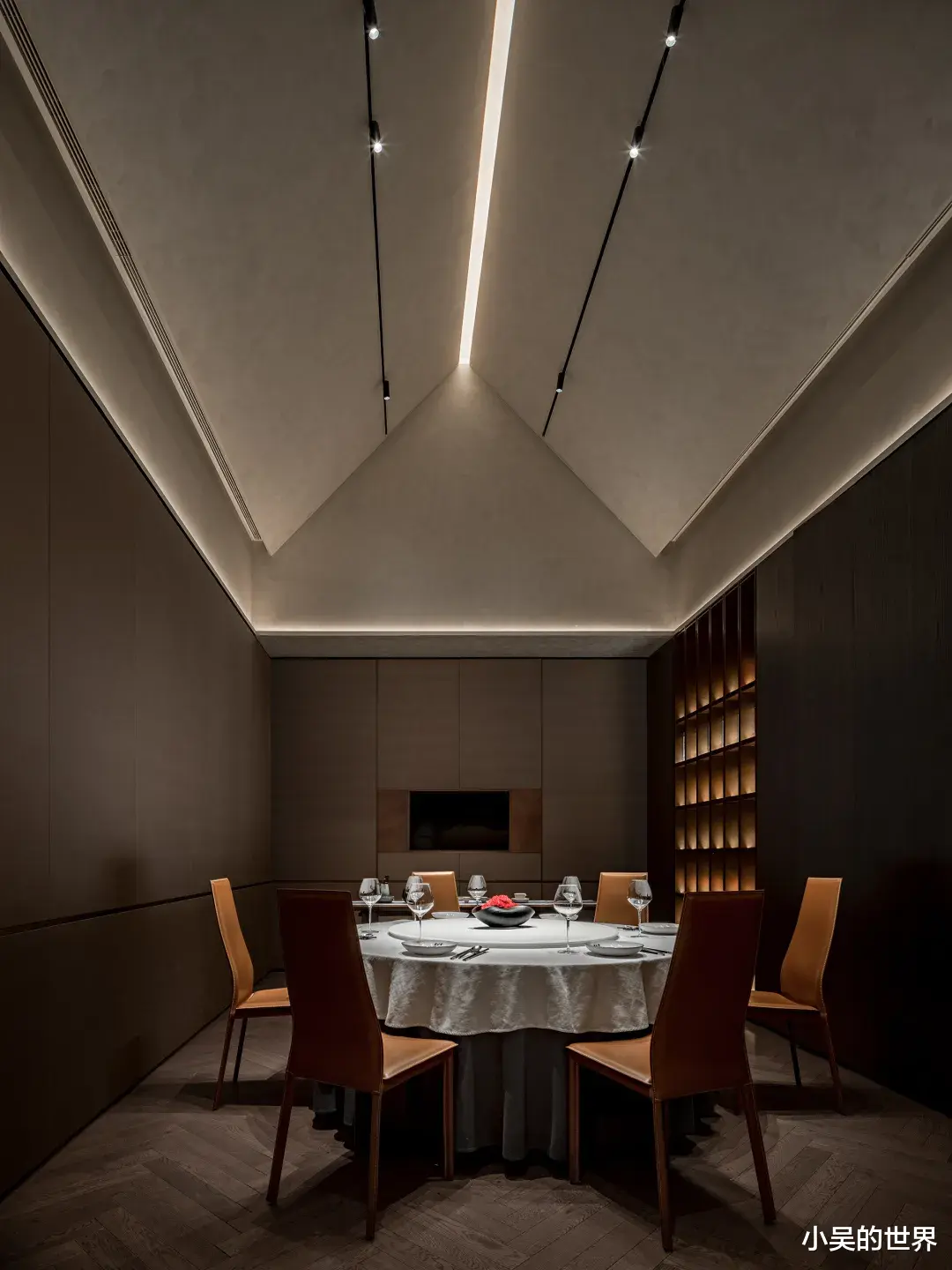 屋顶以其尖顶的弧线勾勒出雕塑般的美丽,在柔和的黄色光芒中,点、线、面的纯粹魅力得以淋漓尽致地展现。精心布置的光点营造出明暗相间的美感,光线只轻轻洒在餐桌上,而阴影则巧妙地遮蔽了背景,仿佛置身于一个舞台,美食与宾客成为了当之无愧的主角。光与烟火交织,化作一股温暖的潮流,深入人心,将原本朴实无华的生活演绎成一首动人的诗篇。