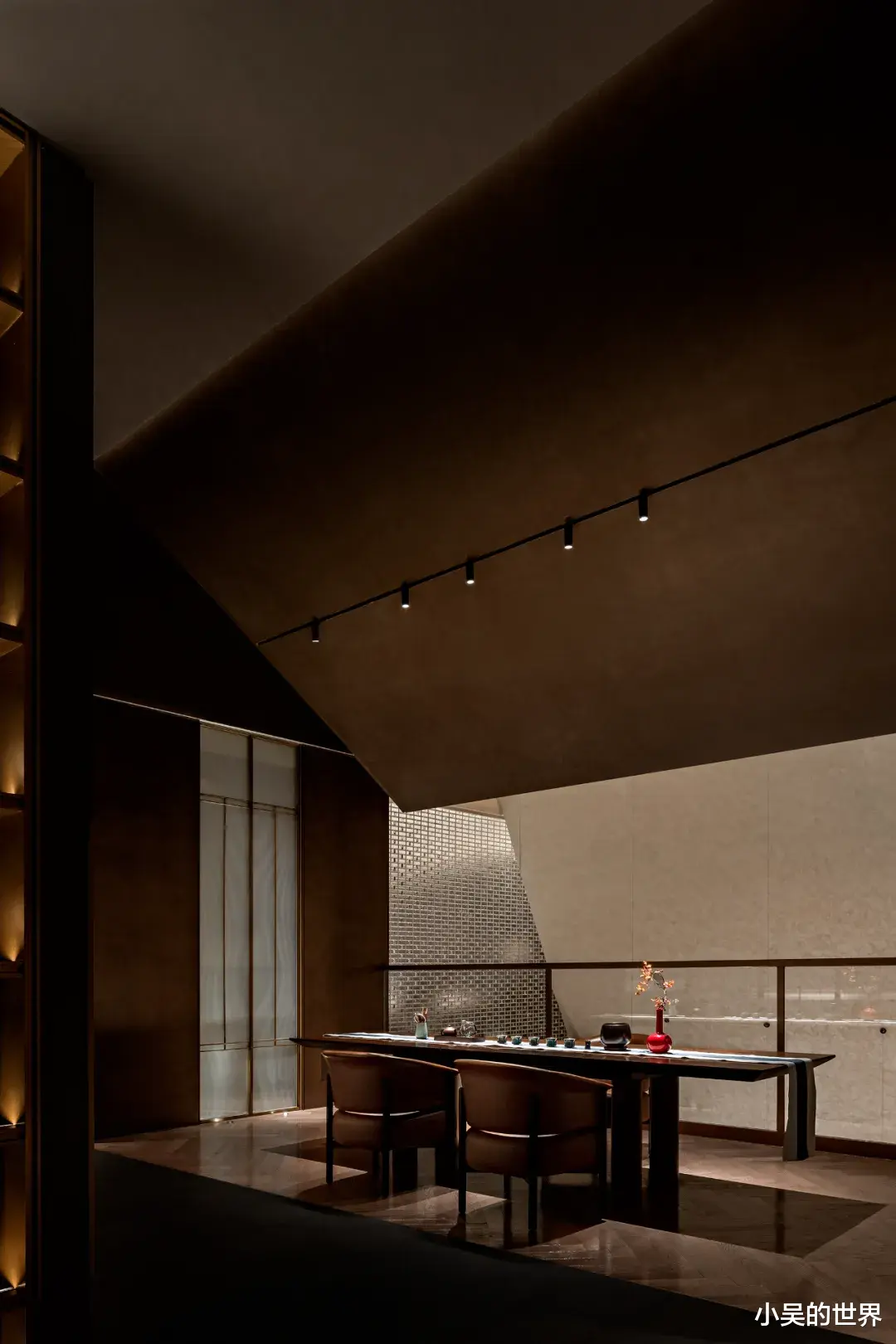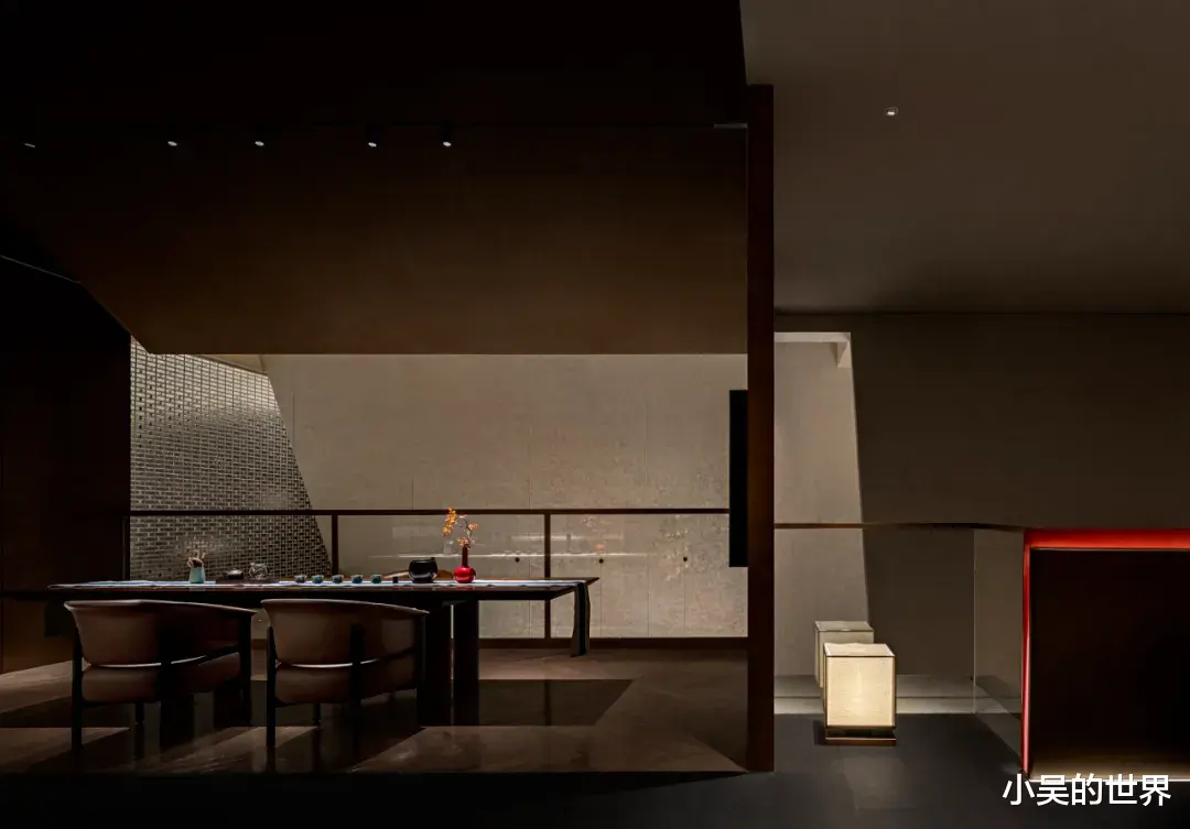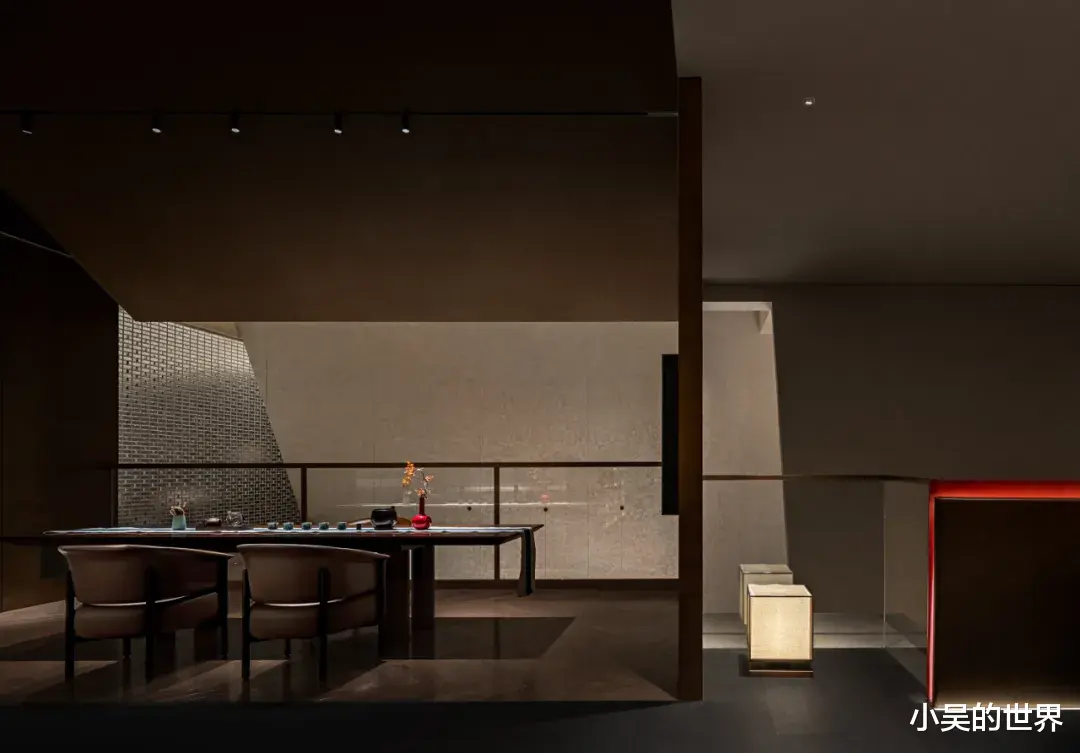 二楼,眼前展现的是一幅和谐而精致的画面。独立的客房以灰色与浅棕色为主色调,简约的设计风格中融入了极具几何特征元素,将中式语境巧妙地融入空间之中,展现出一种独特的东方美学。