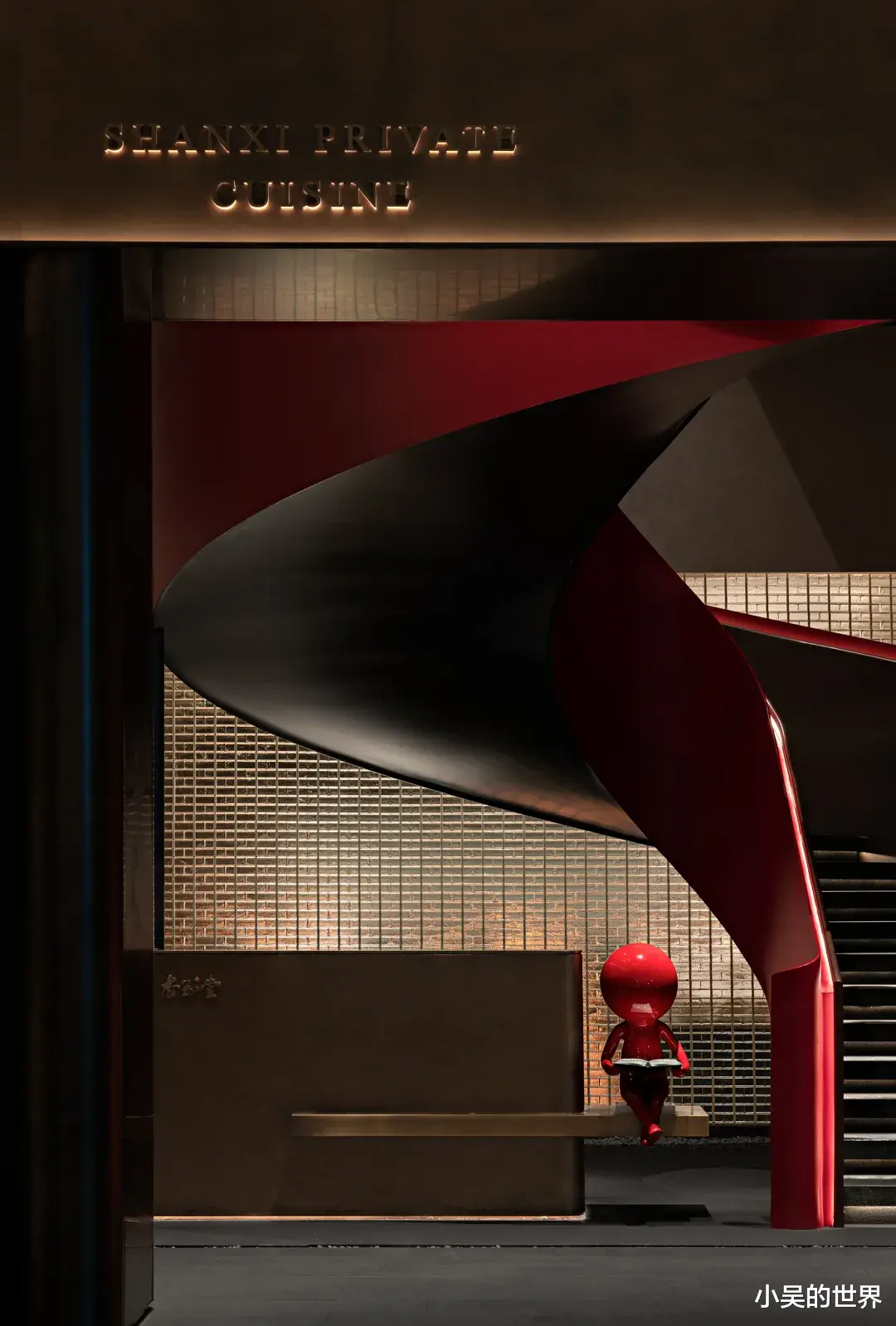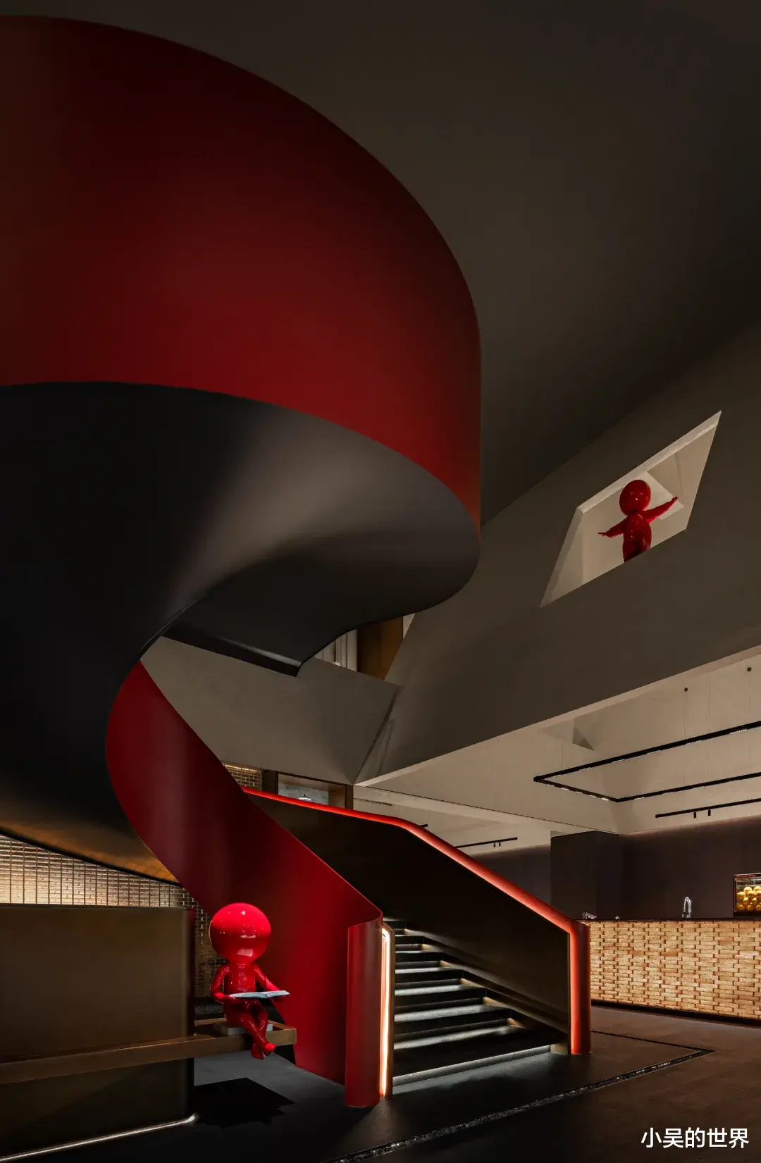 当踏上二楼,眼前景象变幻,红色的楼梯仿佛在视觉上收缩,将三维空间巧妙地折叠进二维平面。眼前,泛着红润光芒的线条交织、叠加,形成一幅错综复杂的图案。