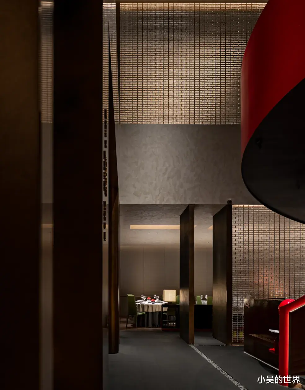 餐厅以中国红为主色调的楼梯成为空间的焦点,它不仅为室内增添了一抹亮丽的色彩,而且承载着东方美学的精髓。这种明暗色调的和谐搭配,营造出一种既繁华又温馨的氛围。