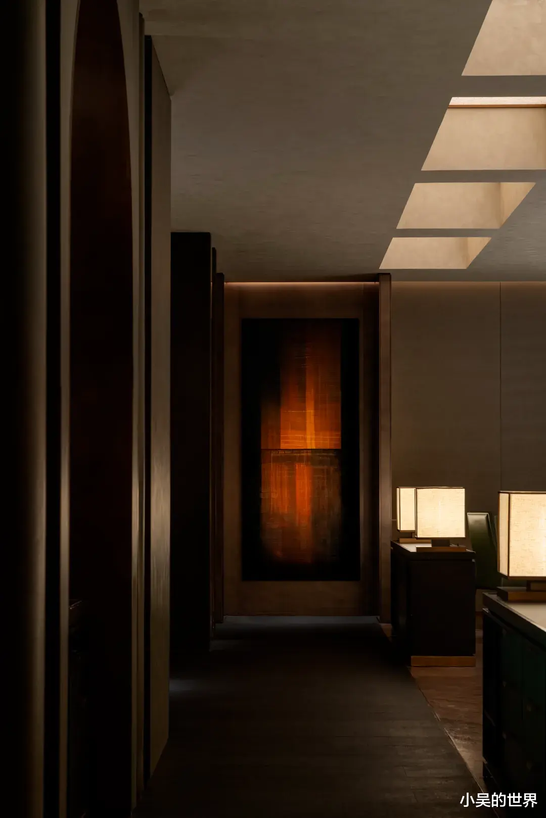 光线轻柔地洒在玻璃砖外墙上,自然地形成了渐变的光影效果。这种明暗交替的剪影与色彩的节奏相互交织,为空间增添了一种丰富而深邃的本质。
