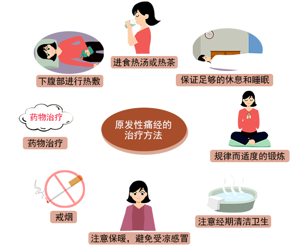 (3)保证足够的休息和睡眠。(4)规律而适度的锻炼。(5)注意经期清洁卫生。(6)注意保暖,避免受凉感冒。(7)戒烟。2.药物治疗:疼痛不能忍受时可在医生指导下辅以药物止痛。(1)前列腺素合成酶抑制剂:通过抑制前列腺素合成酶的活性,减少前列腺素产生,防止过强子宫收缩和痉挛,从而减轻或消除痛经。常用的药物有布洛芬、酮洛芬、甲芬那酸、普奈生等。(2)口服避孕药:通过抑制排卵减少月经前列腺素含量。适用于要求避孕的痛经妇女。