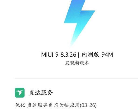 最近这款功能出现在了内测版的MIUI 9系统用户推送的系统更新中,更新包体积为100MB左右,具体版本号是8.3.26。快应用具有免安装、免存储、一键直达和更新直接推送四大优势,本次更新主要是完善快应用的功能。